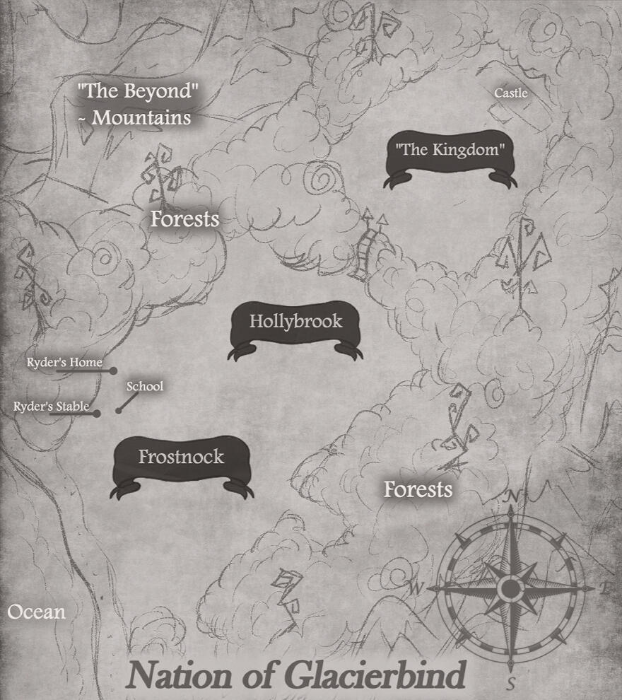 However, for around 2 months of every year, there is a summer solstice. Where the weather shifts, and for that period, the sun shines so bright that all the snow begins to melt. This has turned into a yearly tradition, both religious in nature and creating community events that are commonly participated in. Also, at the end of the 2 months, there's an eclipse that occurs, lasting for 1 week. This is the most dangerous time of the year and is highly feared. Most do not go outside, as it's when many cryptic and paranormal events occur. There is a tale that during the summer solstice, the ice in the forests and mountains melts, and that is where the creatures are unearthed. Then for the week of the eclipse, they emerge from the forest under the darkened lights and lurk anywhere and everywhere. That is, until the full summer solstice is over and they turn back into ice. This tale over the many years scared the people enough that it is also tradition to let the fireplace blaze for the entire week, so that if they did get into homes, the roaring flames would melt them before they took root.Although there is a rich history of development, a cloud of mystery resides about how humans arrived there, whether there is life outside the mountains, and just what is beyond it all. Although it's not confirmed, the people believe the name "Glacierbind" comes from how the nation was originally a large piece of ice during the ice age. There was a gift from the sun that partly melted away this ice, and thus it slid down into the ocean. They theorize this is what the ocean is made up of.